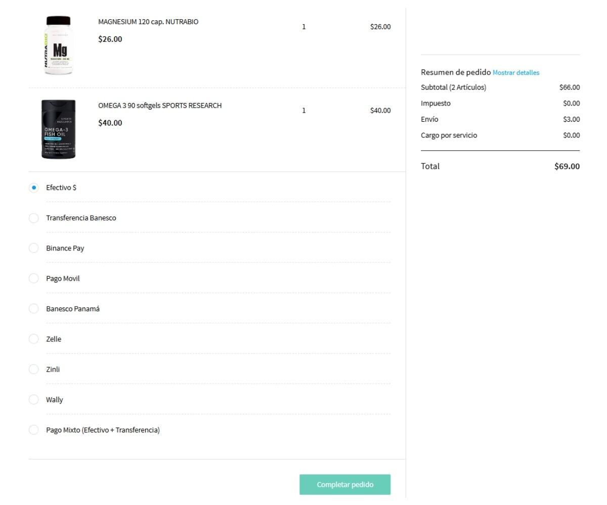 Por último, selecciona el método de pago de tu preferencia y pulsa "Completar Pedido" para finalizar tu solicitud.