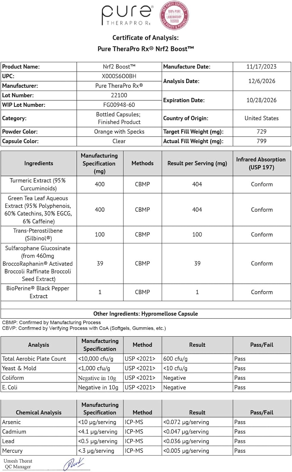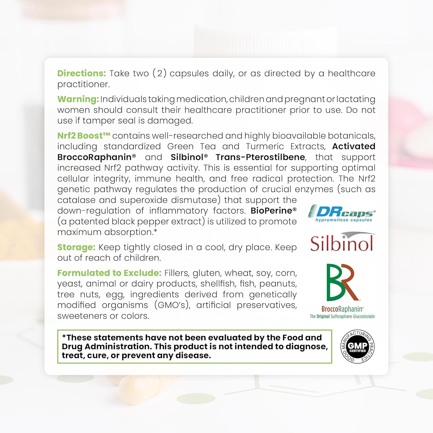 Este suplemento combina ingredientes con fuerte acción antioxidante y reguladora del estrés oxidativo. Contiene extracto de cúrcuma estandarizado al 95% en curcuminoides, sulforafano de brócoli, trans-pterostilbeno y extracto de té verde rico en polifenoles. Estos compuestos han demostrado su capacidad para activar la vía Nrf2, un mecanismo clave en la defensa celular contra el daño oxidativo y la inflamación crónica.