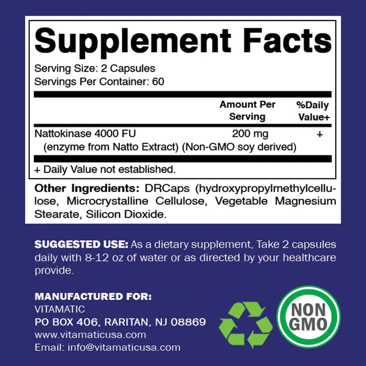 Promueve la salud cardiovascular: La nattokinasa ayuda a reducir la acumulación de fibrina en las arterias, lo que puede favorecer un flujo sanguíneo más eficiente y disminuir el riesgo de eventos cardiovasculares.
