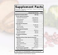 Enzimas específicas para carbohidratos: Amilasa (25,000 DU), Glucoamilasa (50 AGU), Alfa-Amilasa (50 DU).